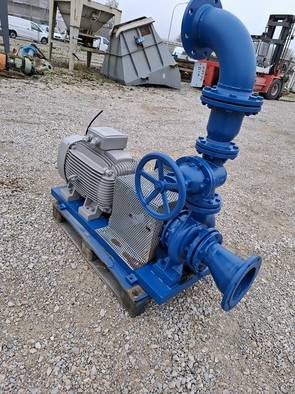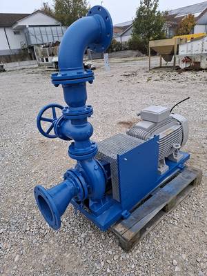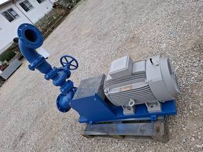 Frischwasserpumpe Fabrikat DIA, komplett inklusive Grundplatte, Reduzierungen, Kupplung und 55 kW Elektromotor. Die Pumpe hat eine maximale Förderleistung von ca. 250 m³/h und eine maximale Förderhöhe von ca. 56m.