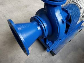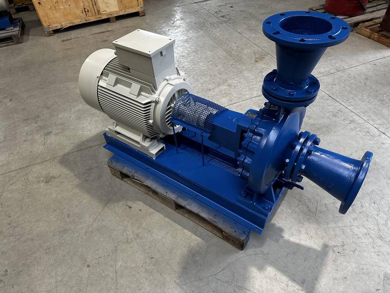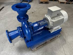 Frischwasserpumpe Fabrikat KSB, komplett inklusive Grundplatte, Reduzierungen, Kupplung und 55 kW Elektromotor. Die Pumpe hat eine maximale Förderleistung von ca. 250 m³/h und eine maximale Förderhöhe von ca. 47m.